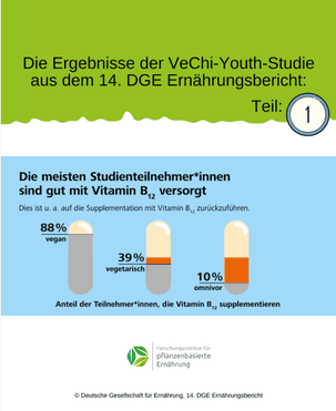 Die VeChi-Youth-Studie zeigte, dass der Großteil der Kinder und Jugendlichen aller drei Ernährungsformen (vegan, vegetarisch, omnivor) ausreichend mit Vitamin B12 versorgt war. Bei den Veganer/innen ist dies darauf zurückzuführen, dass 88 % von ihnen Vitamin B12 supplementieren. Die Vegetarier/innen wiesen eine tendenziell schlechtere Versorgung mit Vitamin B12 auf. Hier ergänzten nur 39 % der Teilnehmer/innen ihre Vitamin-B12-Zufuhr mit Supplementen. Ernährungsexpert/innen raten auch bei einer vegetarischen Ernährung zu einer zumindest gelegentlichen Supplementierung von Vitamin B12. Zudem sollte der Vitamin-B12-Status regelmäßig überprüft werden.