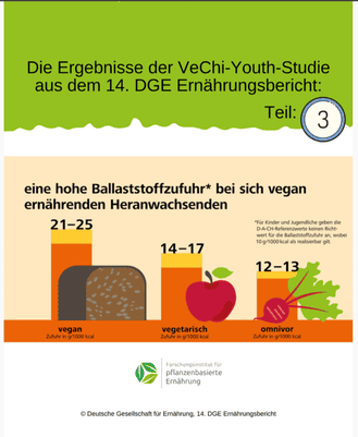 Die VeChi-Youth-Studie zeigte, dass die sich vegetarisch und vegan ernährten Kinder und Jugendliche ein insgesamt gesundheitsförderndes Lebensmittelmuster mit mehr Gemüse, Obst, Hülsenfrüchten und Nüssen aufwiesen. Im Umkehrschluss war in diesen beiden Gruppen auch die mittlere Zufuhr an Ballaststoffen sehr viel höher als in der mischköstlichen Probandengruppe. Veganer/innen nahmen im Durchschnitt am meisten Ballaststoffe (21-25 g/1000 kcal) zu sich im Vergleich zu Vegetarier/innen (14-17 g/1000 kcal) und Mischköstler/innen (12-13 g/1000 kcal).