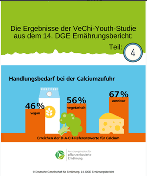 Die VeChi-Youth-Studie ergab, dass Calcium ein weiterer kritischer Nährstoff in der Ernährung von Kindern und Jugendlichen ist: Alle drei Ernährungsformen (vegan, vegetarisch, omnivor) erreichten die Zufuhrempfehlungen nicht. Allerdings erreichten nur weniger als die Hälfte der Veganer/innen die D-A-C-H-Referenzwerte für die Calciumzufuhr. Bei den Vegetarier/innen waren es 56 %, bei den Mischköstler/innen ebenfalls nur 67 %.