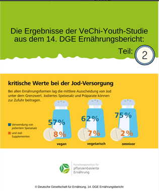 Die Jodzufuhr sollte unabhängig der Ernährungsform bei Kindern und Jugendlichen verbessert werden, beispielsweise kann dies durch die Verwendung von jodiertem Speisesalz und Jod-Supplementen erreicht werden. Nur 57 % der Veganer/innen nutzten ein jodiertes Speisesalz im Vergleich zu 62 % der Vegetarier/innen und 75 % der Mischköstler/innen.